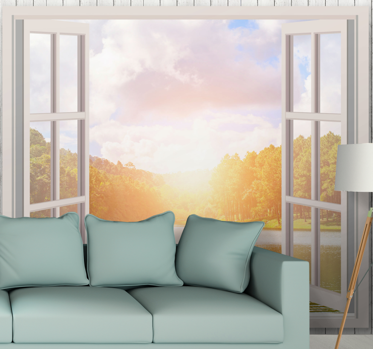 Référence: F12132Une scène tranquille représentant un lever de soleil sur un lac serein, encadrée par une fenêtre ouverte. Une végétation luxuriante borde les rives, avec de beaux arbres se reflétant dans l'eau. La lumière douce crée une ambiance paisible, invitant à la sérénité et à la détente.