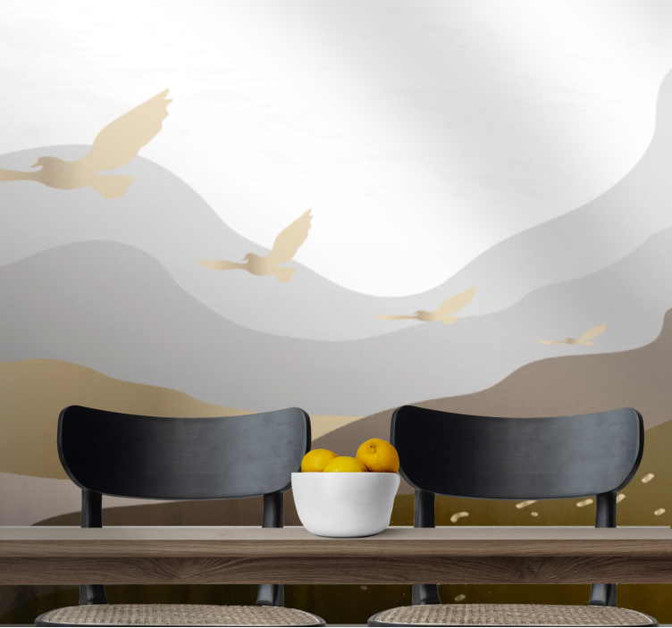 Référence: F12060Des silhouettes élégantes d'oiseaux s'élèvent au-dessus des collines ondulantes et des montagnes en couches. Le design capture magnifiquement l'essence de la nature, mettant en avant un paysage serein avec des formes simples et des tons terreux. L'agencement harmonieux favorise une atmosphère tranquille, invitant à se connecter avec l'extérieur.