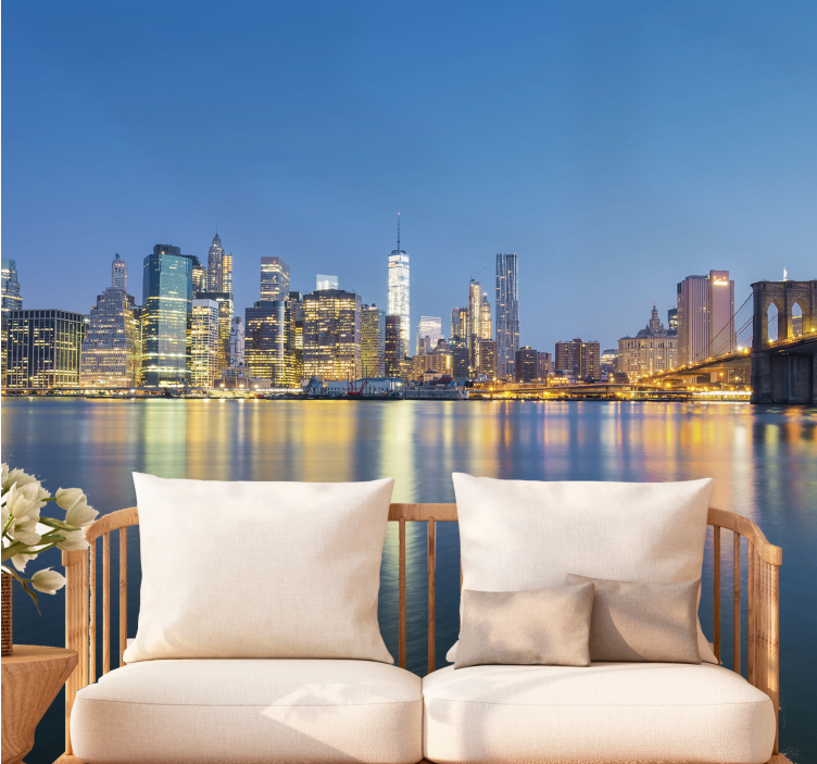 Référence: F12099Le design présente une vue époustouflante de la skyline de New York, mettant en valeur des structures emblématiques illuminées au crépuscule. La scène inclut le Brooklyn Bridge s'arc-boutant gracieusement au-dessus de l'eau, complété par des lumières de la ville vibrantes se reflétant à la surface, créant une atmosphère pittoresque.