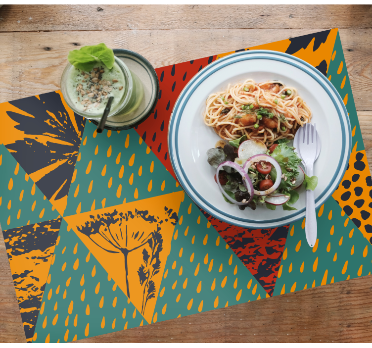 Apportez une touche d'originalité à votre table avec notre Set de table original motif géométrique audacieux. Ce design vibrant et coloré, inspiré par des motifs de triangles, évoque une pluie d'animaux et de végétation jungle. Avec une touche tribale et florale, il transforme vos repas en une expérience moderne et abstraite.