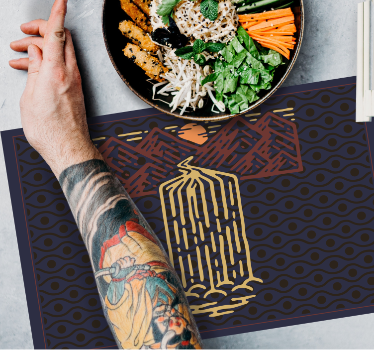 Offrez à votre table une touche d'originalité avec notre Set de table original scène de cascade en montagne. Ce design captivant met en avant une cascade majestueuse entourée de montagnes et de motifs africains au style abstrait. Évoquant la nature dans toute sa splendeur, ce dessin artistique transformera votre espace en une véritable œuvre d'art.