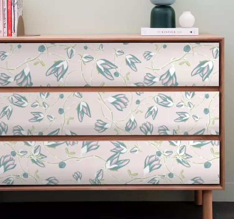 Découvrez notre adhésif meuble tiroir à motifs floraux, un produit qui allie élégance et originalité. Avec son modèle unique orné de fleurs et de feuilles aux teintes de rose et de vert, ce design floral apportera une touche de fraîcheur à vos meubles et sublimer votre intérieur. Transformez vos tiroirs en véritables œuvres d'art !