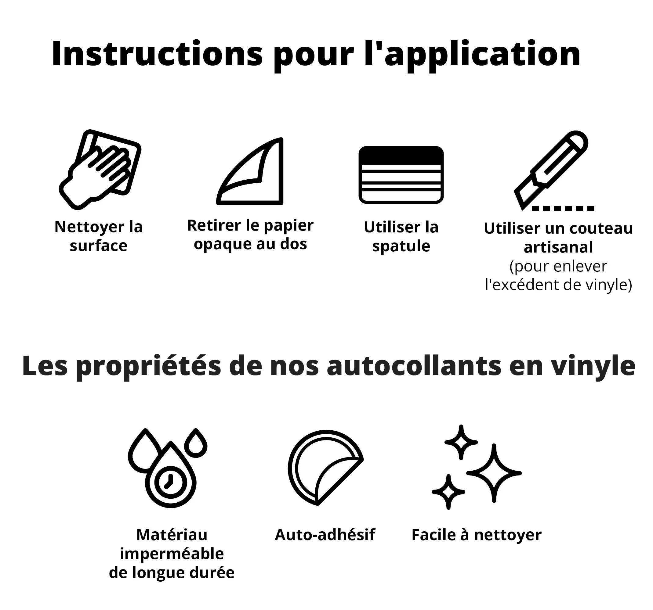 Ne jamais utiliser de produit à vitre pour nettoyer vos surfaces. Celui-ci laisse des particules qui empêchent la bonne adhérence du sticker. Il est conseillé d'utiliser de l'eau ou de l'alcool (de pharmacie) pour procéder au nettoyage de votre surface.