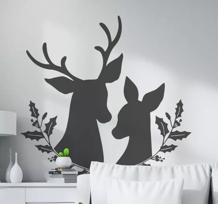 Référence: A46840Une charmante représentation de deux cerfs avec des bois élaborés et des expressions douces, encadrée par des branches de houx. Ce design évoque une sensation de chaleur et de connexion à la nature, parfait pour transformer n'importe quel espace en un environnement serein et accueillant.