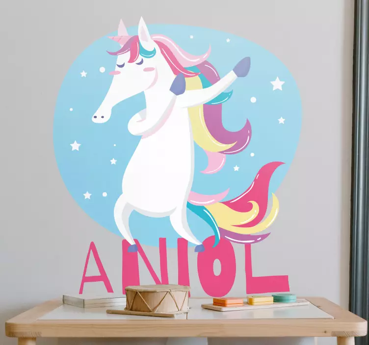 Référence: A47669Un unicorn coloré danse joyeusement sur un fond bleu apaisant, entouré d'étoiles. Ce design capture l'esprit fantaisiste de l'enfance et de l'imagination, ce qui en fait un choix délicieux pour les espaces personnels. Le produit peut être personnalisé pour ajouter une touche unique.