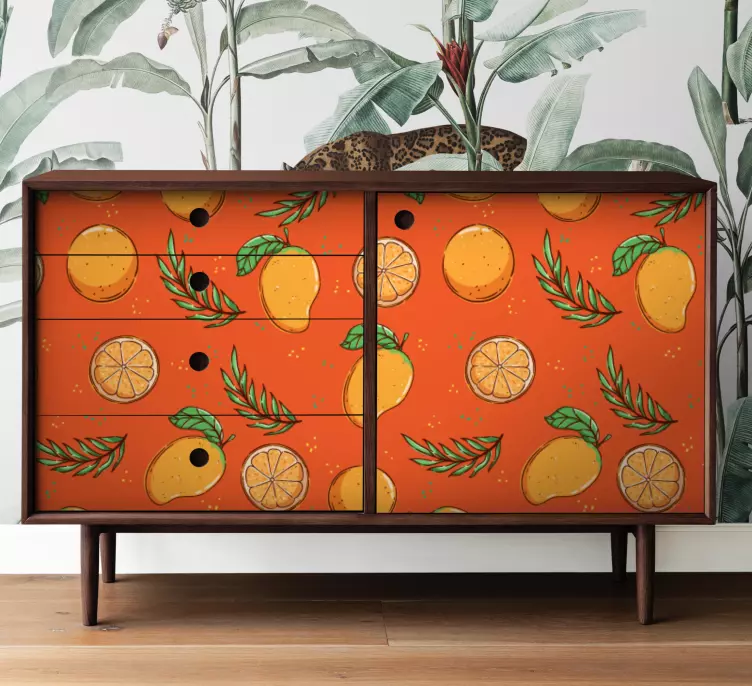 Apportez une touche de fraîcheur et de couleur à votre intérieur avec notre Sticker déco motif agrumes. Ce design éclatant met en avant des fruits juteux comme des oranges et des citrons, entourés de feuilles luxuriantes. Avec ses couleurs vives et son aspect brillant, ce sticker transformera vos meubles en véritables œuvres d'art, créant une ambiance joyeuse et accueillante dans chaque pièce.