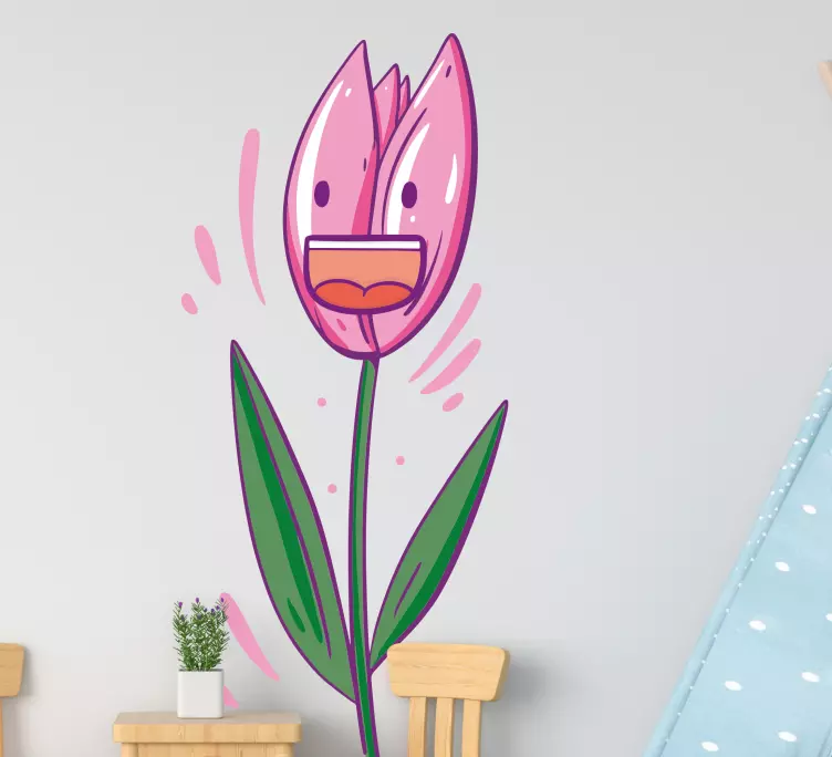 Découvrez notre Sticker fleur design de tulipe joyeuse, une illustration pleine de vie qui évoque la beauté des fleurs. Ce motif espiègle de tulipe pousse un cri de joie en hurlant de bonheur. Avec son allure drôle et amusante, il apportera une touche pétillante à votre décoration intérieure !