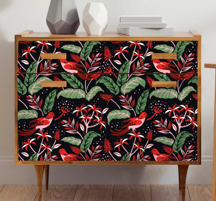 Découvrez notre Sticker fleurs et plantes concept floral tropical, une œuvre d'art colorée qui apporte une touche de nature à votre intérieur ! Avec ses motifs de feuilles luxuriantes, d'oiseaux vibrants et de fleurs exotiques en rouge et vert, ce modèle dynamise votre décoration. Idéal pour égayer vos meubles, ce sticker est un véritable clin d'œil à la beauté tropicale !
