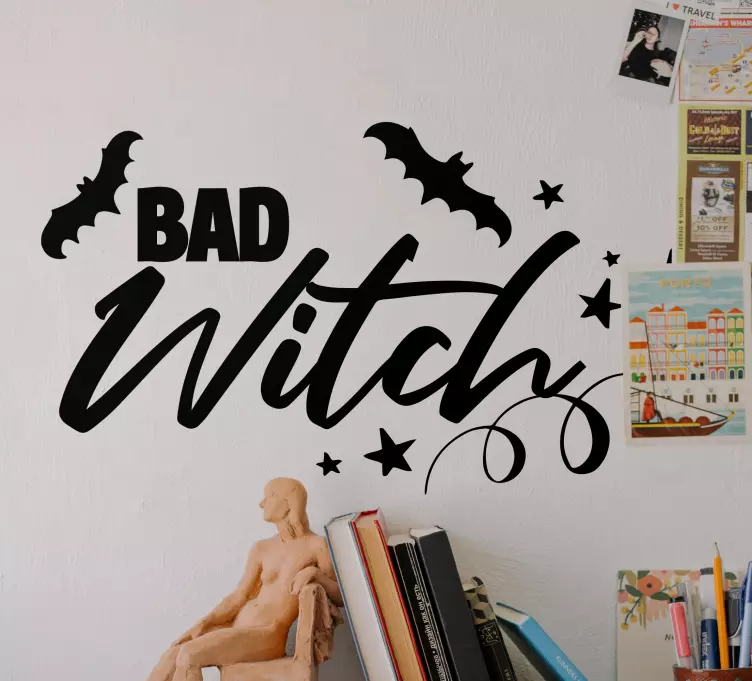 Référence: A51376Un design saisissant mettant en avant la phrase 'Bad Witch', ornée de chauves-souris ludiques et d'étoiles. Idéal pour ajouter une touche fantaisiste à votre décoration d'Halloween, cette pièce capture l'esprit de la saison avec une esthétique audacieuse et monochrome.