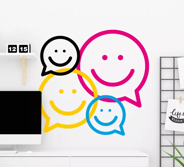 Référence: A49042Une disposition ludique de visages souriants de différentes tailles et couleurs représente la joie et la communication. Ces icônes joyeuses, stylisées avec des bulles de dialogue, évoquent des émotions et créent une atmosphère vivante, parfaite pour des espaces visant à inspirer la positivité.