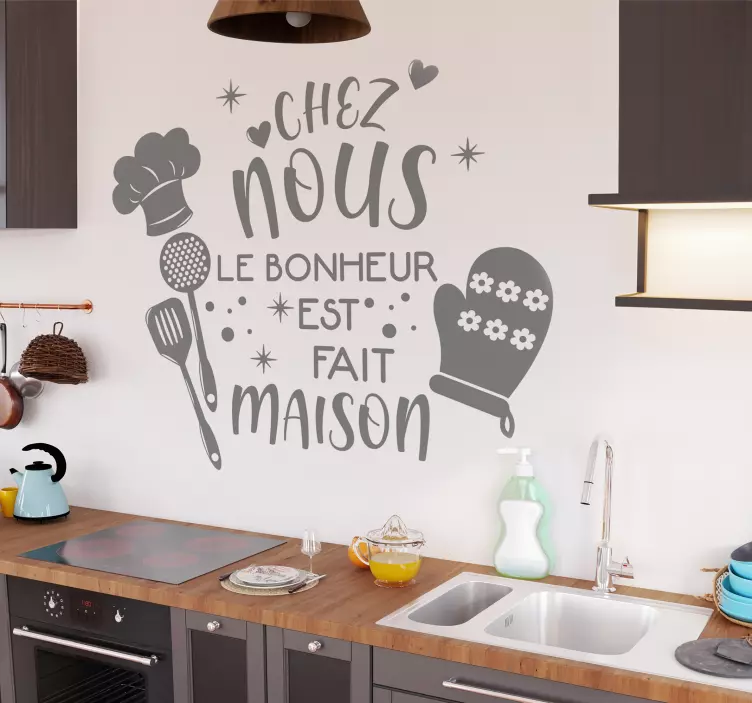 Référence: A39775Le sticker recette citation le bonheur est fait maison est un véritable hommage à la joie de vivre à la maison ! Ce design graphique met en valeur les ustensiles de cuisine français et crée une atmosphère chaleureuse et accueillante. Les couleurs vives et les détails minutieux apportent une touche de bonheur à n'importe quelle pièce de la maison. Laissez cette citation inspirante vous rappeler que le bonheur se trouve dans les petits plaisirs du quotidien !