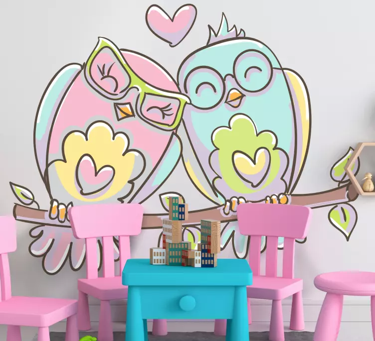 Apportez une touche de douceur et de gaieté à votre intérieur avec ce Sticker oiseaux oiseaux d'amour adorables ! Ce motif enchanteur met en avant des hiboux et des chouettes, tous en couple, illustrant l'amour et l'affection dans des tons de rose et de bleu. Ces oiseaux sont tout simplement mignons et apportent une ambiance joyeuse à n'importe quelle pièce, faisant sourire tous ceux qui les aperçoivent.