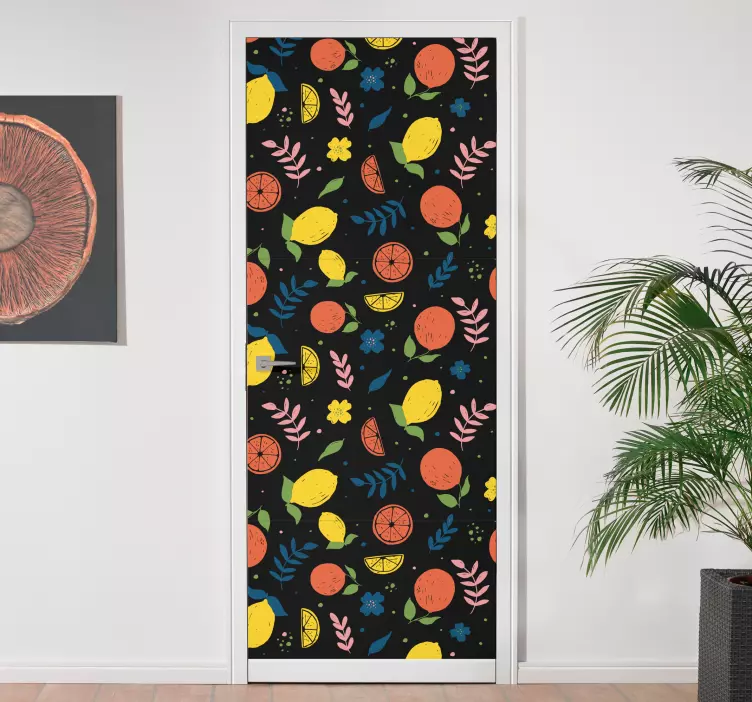 Découvrez notre Sticker porte motifs d'agrumes colorés, une illustration vibrante qui égaye instantanément n'importe quelle porte ! Avec des motifs de fruits d'agrumes tels que des oranges et des citrons, ce design floral se détache sur un fond noir élégant. Les couleurs éclatantes de cet autocollant apportent une touche de fraîcheur et de joie à votre intérieur !