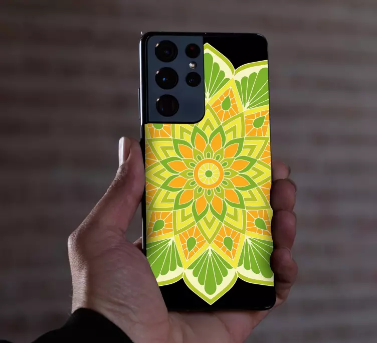 Référence: A53442Un motif de mandala floral vibrant présentant des formes géométriques complexes dans des teintes de vert, jaune et orange. Ce design combine des éléments naturels pour créer une apparence harmonieuse et accrocheuse, idéale pour embellir tout objet personnel.