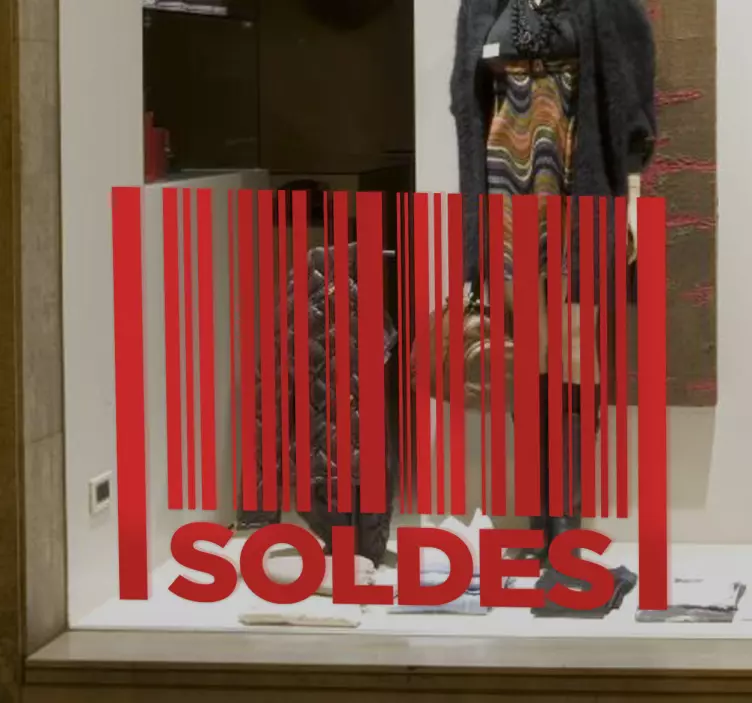 Sticker 'soldes' avec illustration d'un code barre. Idéal pour les boutiques pour mettre en avant leurs promotions du moment. Faites savoir à tous vos clients que c'est les soldes chez vous avec cet autocollant original applicable sur toutes surfaces et notamment les vitrines. Décorez votre boutique avec nos adhésifs.