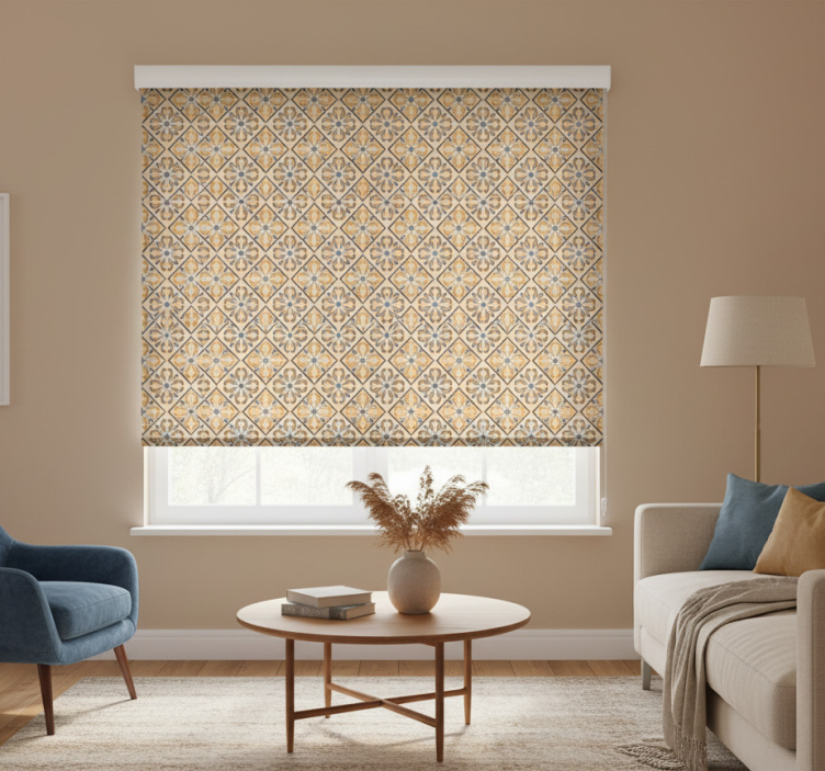 Store enrouleur beige motif baroque or et bleu