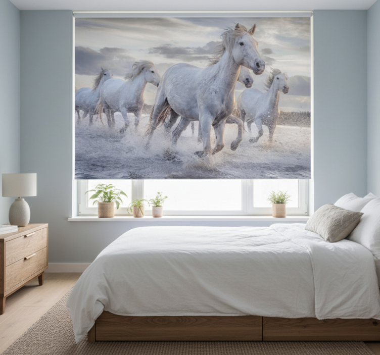 Référence: E9953Découvrez notre store enrouleur blanc fresque de chevaux arrosés, un véritable chef-d'œuvre de design qui embellit n'importe quel intérieur. Ce motif captivant, avec ses chevaux majestueux et le doux arrosage, crée une ambiance chaleureuse et accueillante. Laissez-vous séduire par l'harmonie entre l'élégance et la nature, apportant une touche de fraîcheur à votre décoration.