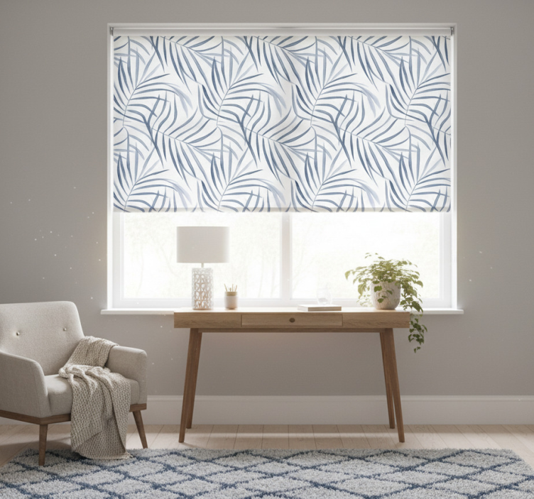 Store enrouleur bleu motif feuilles fines