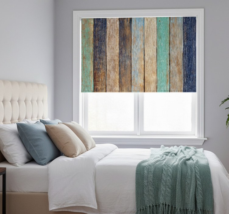 Store enrouleur chambre planches en bois colorées