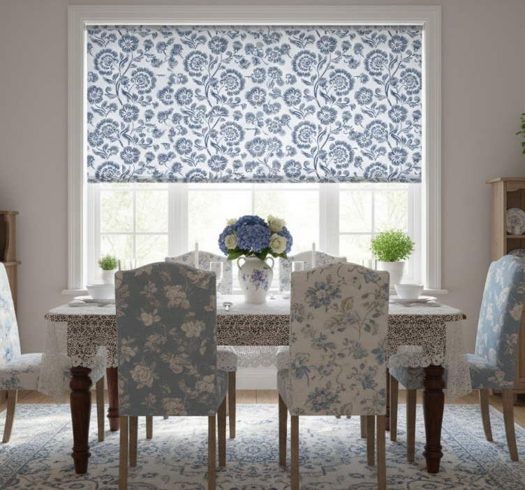 Store enrouleur salle à manger fleurs bleues grandmillenial