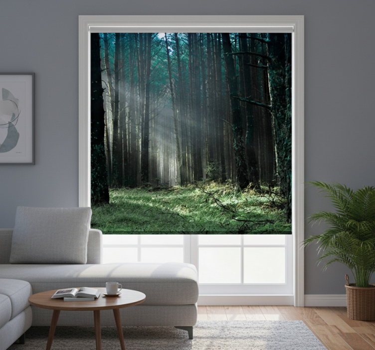 Store enrouleur salon forêt brumeuse bleue