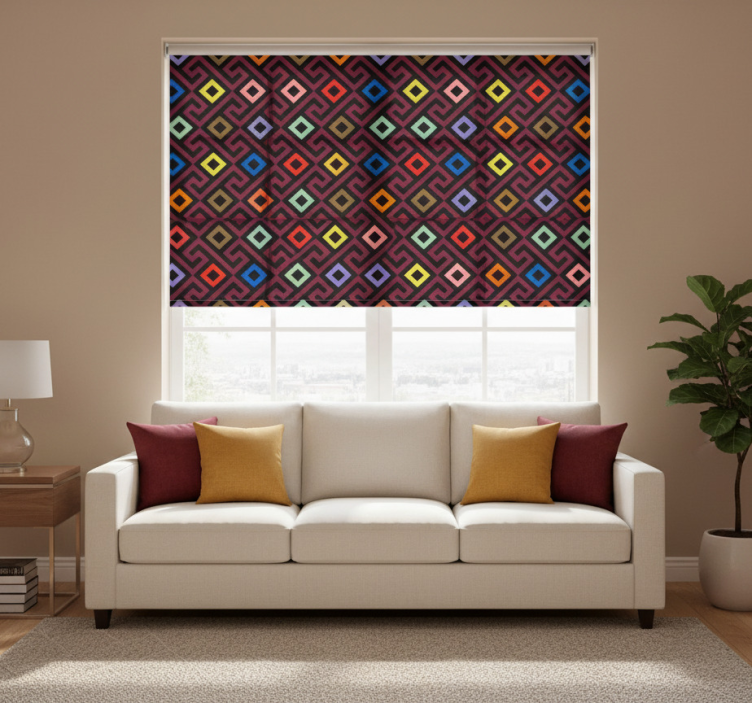 Store enrouleur salon motif labyrinthe géométrique coloré