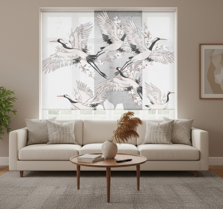 Store enrouleur salon rayures artistiques oiseaux orientaux
