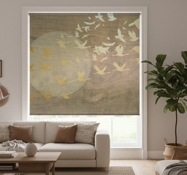 Store enrouleur salon soleil oriental doré avec oiseaux