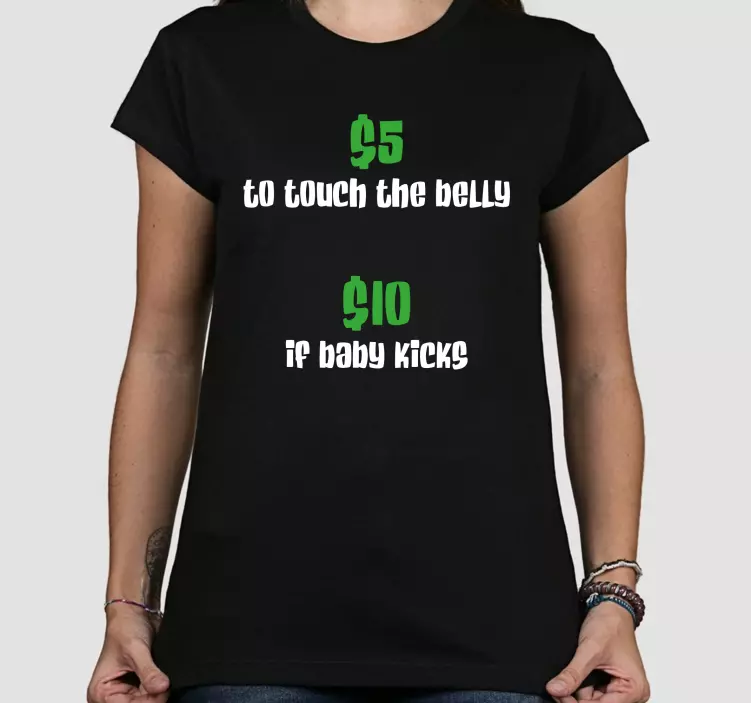Référence: T5441Ce design ludique présente une approche humoristique des interactions liées à la grossesse, avec un texte vert vif sur fond noir. Il propose de manière légère de toucher un ventre de femme enceinte avec des prix amusants, ce qui le rend parfait pour les futurs parents ou les baby showers.