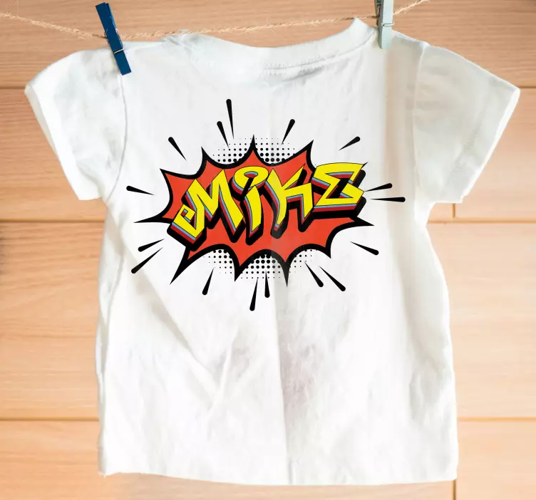 Référence: T4538Ce design ludique présente une explosion de style bande dessinée avec le nom 'Mike' affiché de manière proéminente. Les couleurs vives et les formes dynamiques créent un attrait énergique, parfait pour une atmosphère amusante et joyeuse pour les enfants.