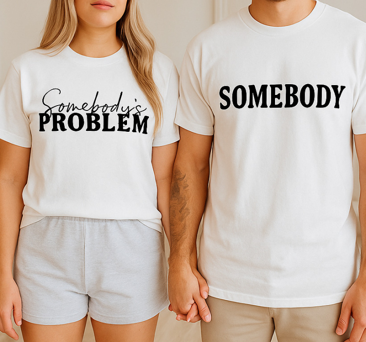 Choisir ce T-shirt couple c'est opter pour une pièce qui raconte votre histoire à deux ! Affichez votre complicité avec ce T-shirt couple problème de quelqu'un qui ne manquera pas de faire sourire votre entourage. Parfait pour des sorties en amoureux, des anniversaires ou des événements spéciaux, ce t-shirt est bien plus qu'un simple vêtement, c'est une déclaration d'amour !