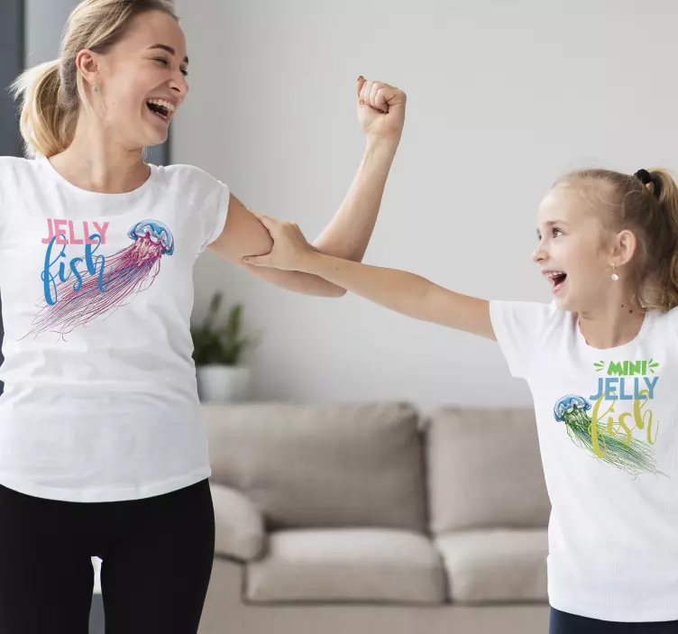 Référence: T5235Cette image vivante met en scène une mère et sa fille partageant des moments joyeux, toutes deux vêtues de tops assortis ornés d'images de méduses vibrantes. Le design ludique souligne leur lien et crée une atmosphère amusante et colorée, parfaite pour exprimer l'amour et la convivialité.