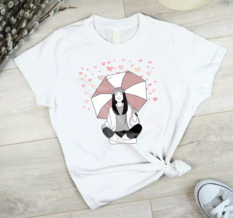 Découvrez notre T-shirt motif de cœurs charmants, une pièce joyeuse qui apporte une touche ludique à votre garde-robe ! Avec son illustration inspirée d'un dessin animé, ce t-shirt présente une adorable fille souriante, un parapluie et de nombreux cœurs qui évoquent l'amour et la magie d'une journée pluvieuse. Ce design mignon et coloré est parfait pour les occasions décontractées tout en garantissant un confort optimal.