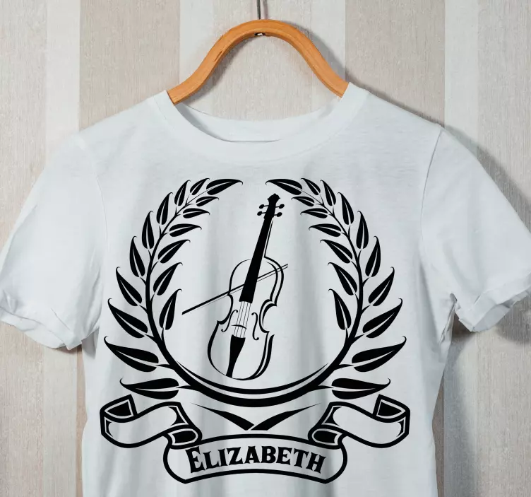 Référence: T4492Ce design unique présente un violon au centre, entouré d'une couronne de laurier. Le nom 'Elizabeth' est élégamment affiché sur un ruban sous l'emblème, signifiant une touche personnelle. Le schéma de couleurs monochromatique souligne la nature classique et raffinée du thème.