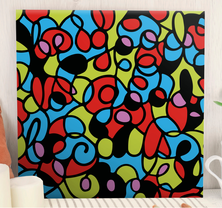 Référence: Q8726Une composition vibrante présentant un éventail dynamique de formes tourbillonnantes. Le design se caractérise par un mélange ludique de couleurs, y compris des rouges, des bleus et des verts audacieux, entrelacés dans un motif abstrait. Cette pièce captivante dynamise n'importe quel espace avec son design vivant.