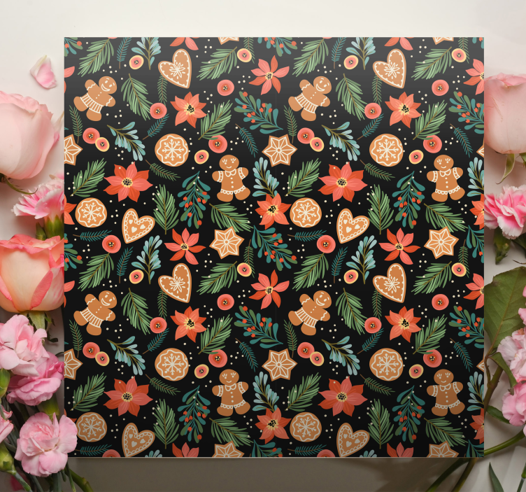 Référence: Q6490Les éléments festifs présentent des figurines en pain d'épice, des cœurs et des fleurs de poinsettia, tous ornés d'un feuillage vibrant. Ce motif capture un esprit de fête joyeux avec des détails charmants, y compris des étoiles décoratives et des tranches d'orange qui enrichissent le thème saisonnier global.