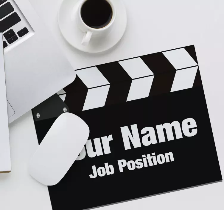 Découvrez le Tapis de souris nom style clap de cinéma, un accessoire unique qui allie esthétisme et fonctionnalité! Avec un design inspiré du monde du film, ce tapis arbore un magnifique motif en noir et blanc évoquant un clap de cinéma. Parfait pour personnaliser votre espace de travail, il met en avant votre passion pour le cinéma tout en intégrant subtilement votre nom et votre titre d'emploi. Ce produit est idéal pour les passionnés de cinéma et de créativité!