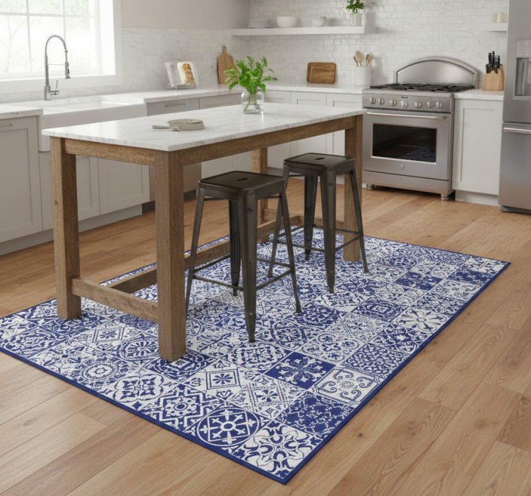 Tapis vinyle cuisine collage porcelaine cobalt