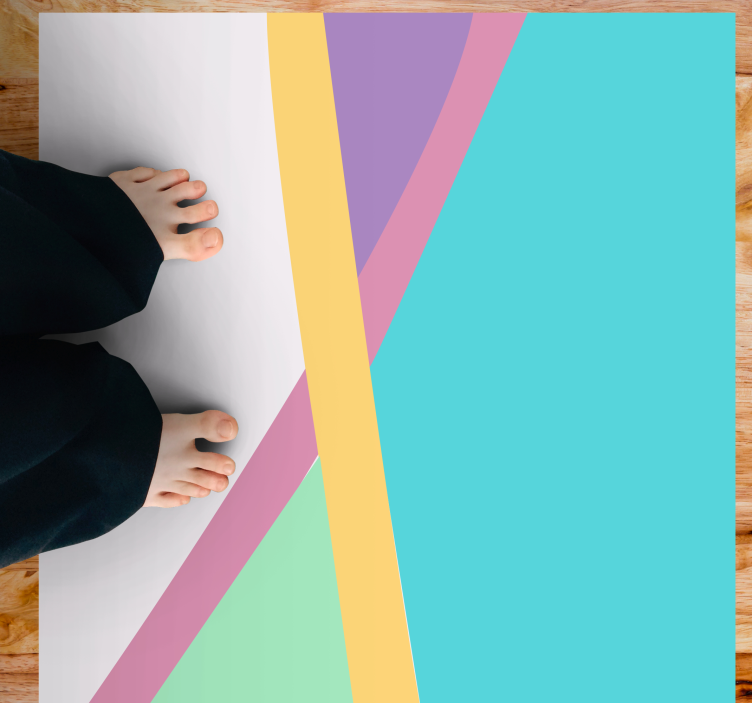 Apportez une touche de modernité à votre intérieur avec notre Tapis vinyle design moderne couches abstraites colorées. Ce tapis présente un motif captivant de rayures géométriques colorées qui se mêlent à des formes abstraites dans des teintes sarcelle et pastel. Un véritable tableau au sol qui illuminera n'importe quelle pièce !